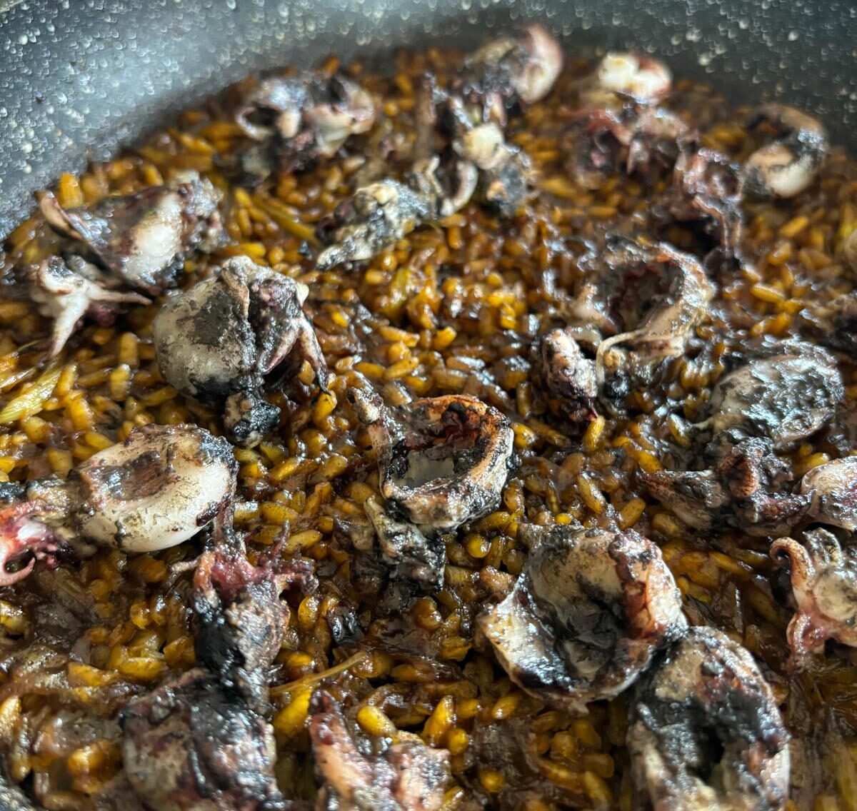 - Cook over medium-high heat for 10 minutes. Distribute the rice evenly and place the sepionets on top.